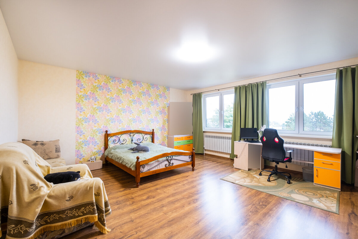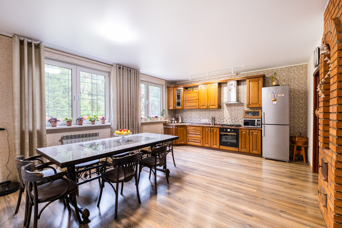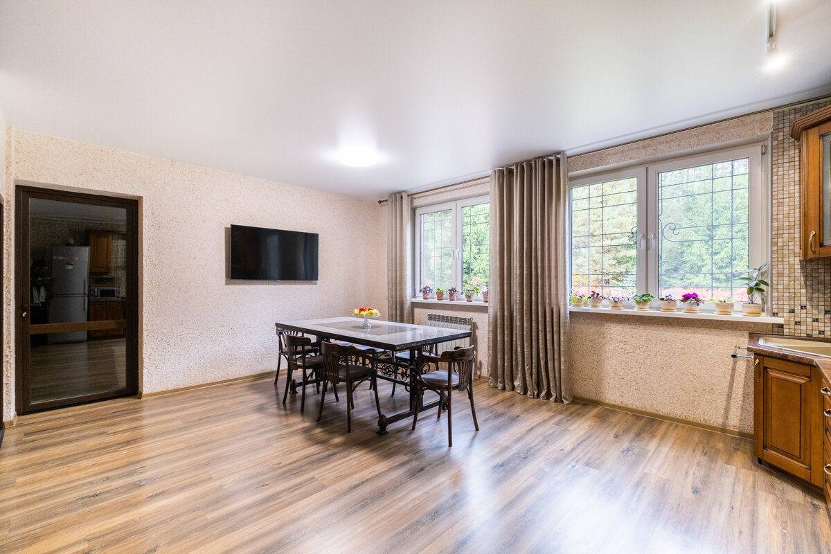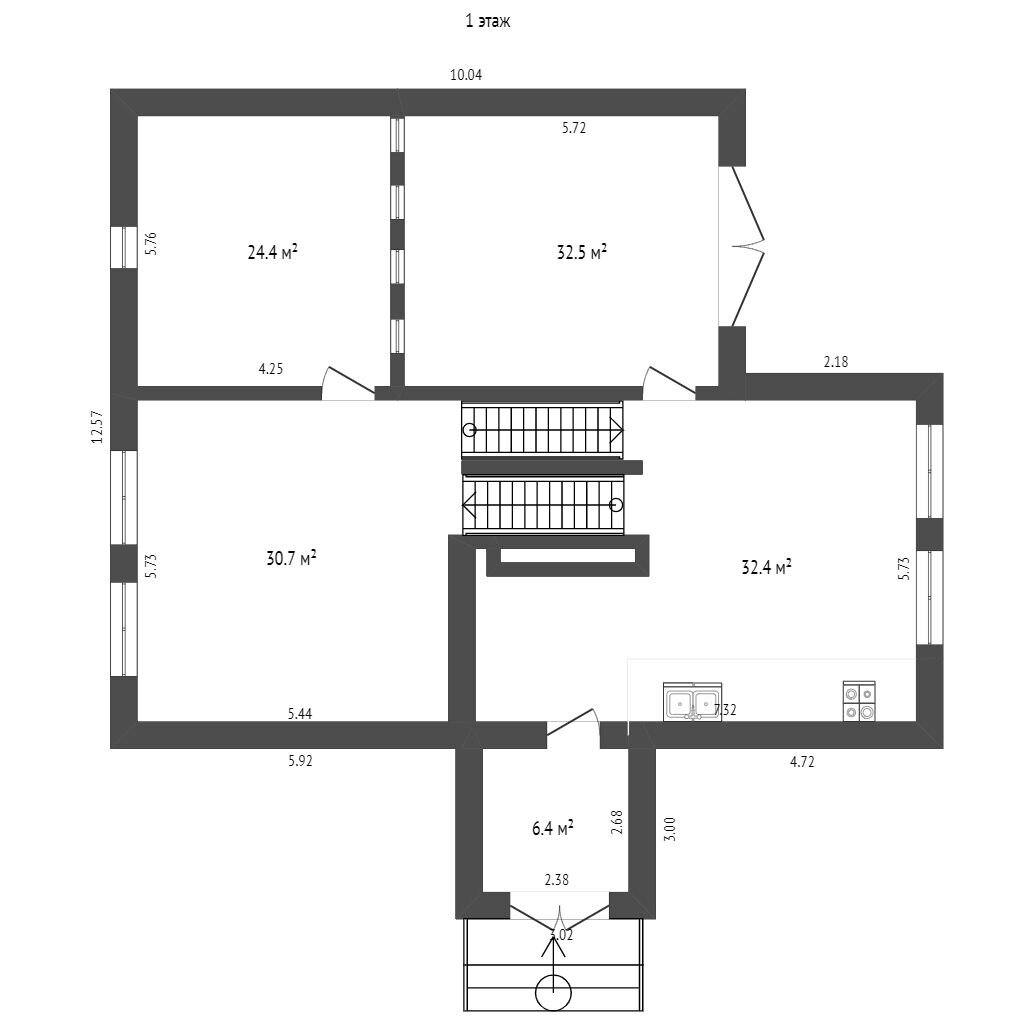 Первый этаж: просторная гостиную 30,7 м2, кухня 24 м2 и жилая комната 24,4м2. На первом этаже оборудован гостевой санузел. Из дома выход в гараж - 32,5 м2, за гаражом ещё помещение 24м2.