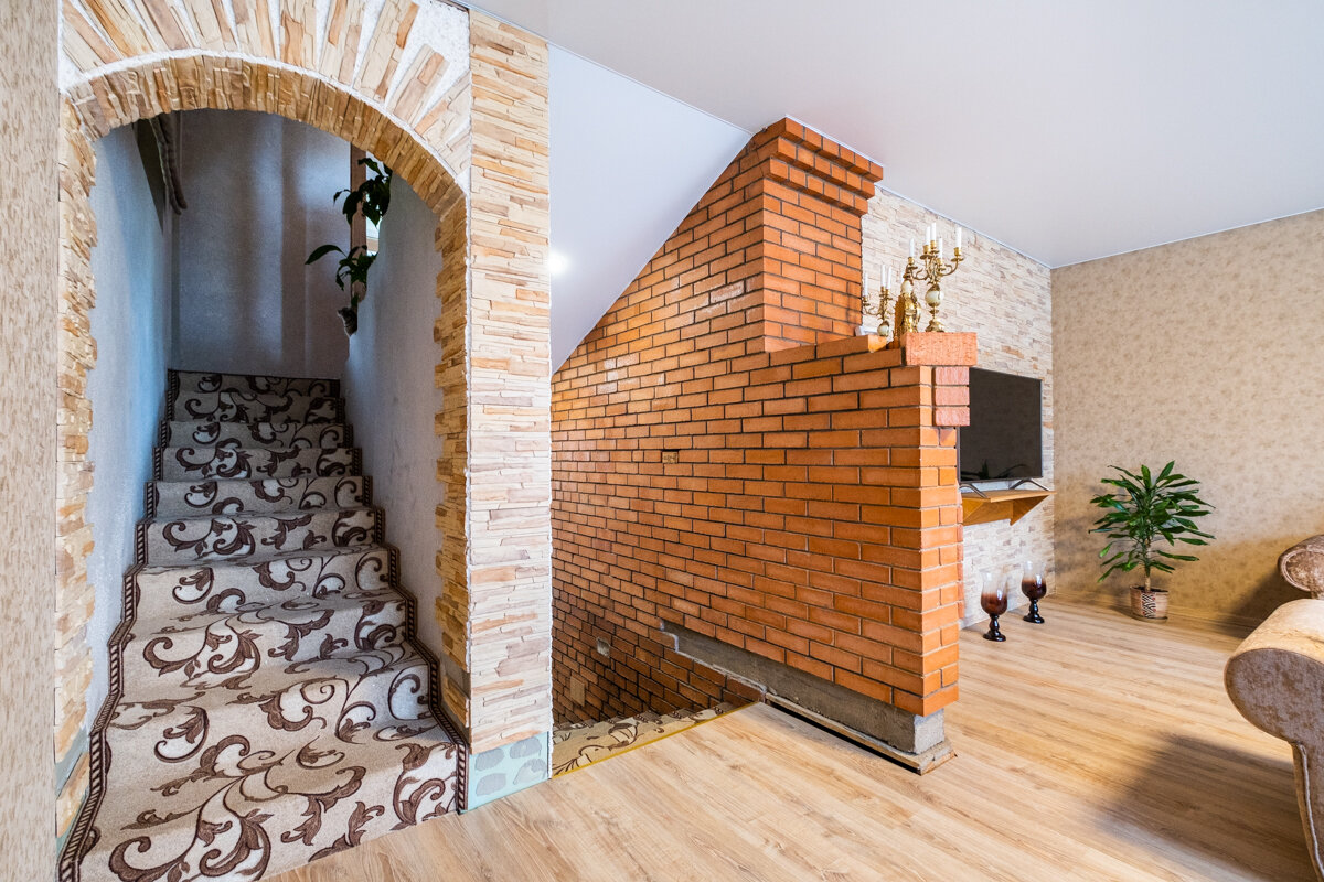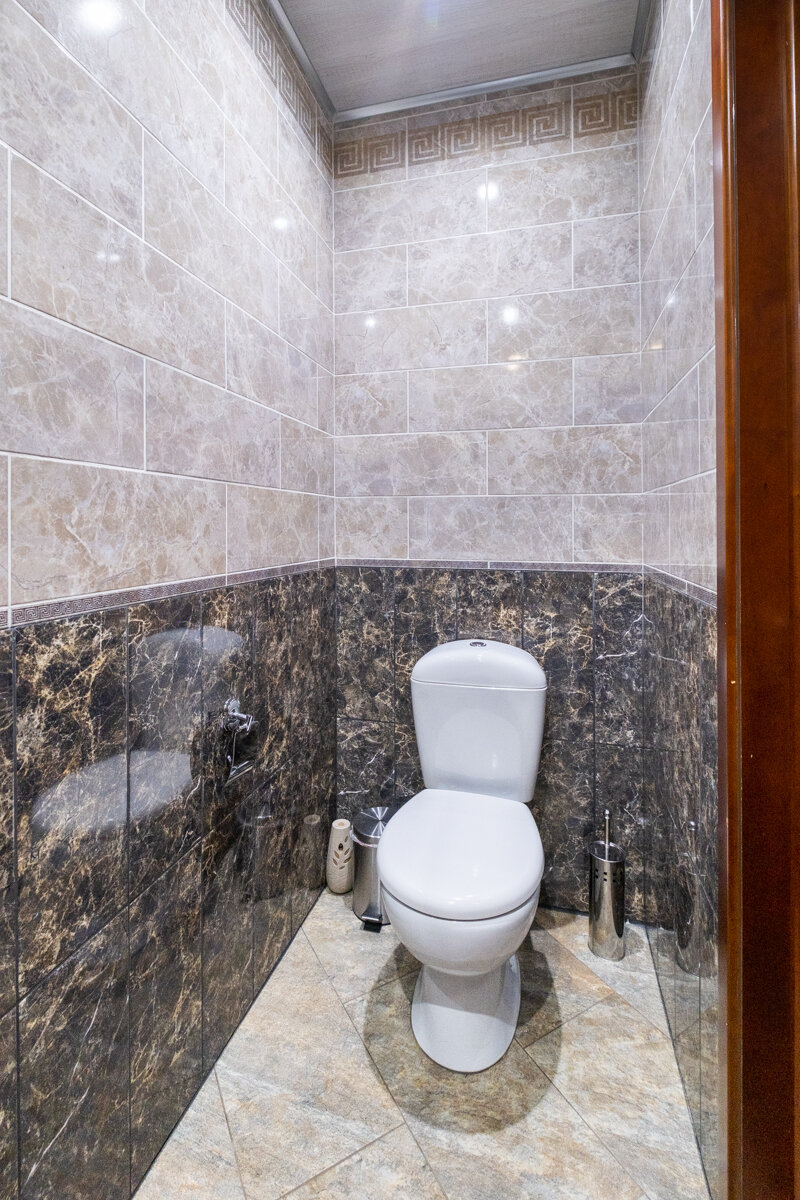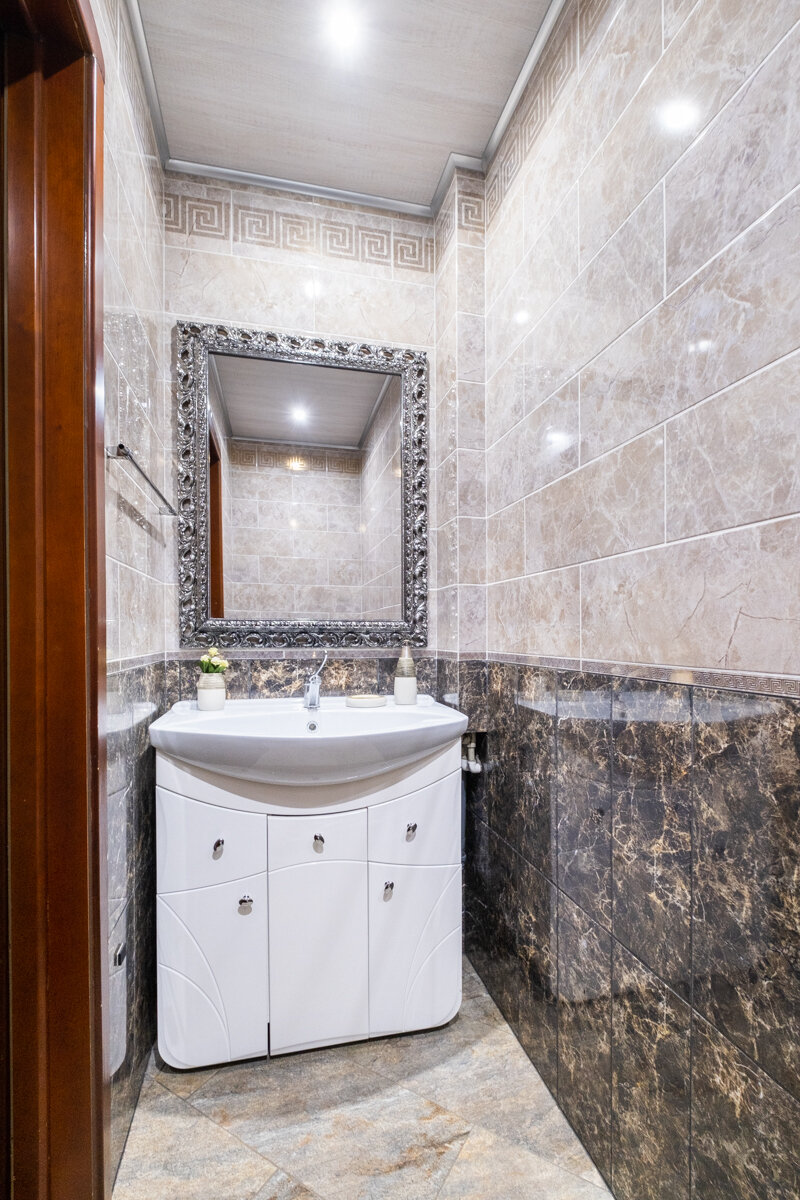 В качестве напольных покрытий в зависимости от зон использовались плитка и ламинат. Стены отделаны жидкими обоями и листовыми обоями, в санузлах керамической плиткой.