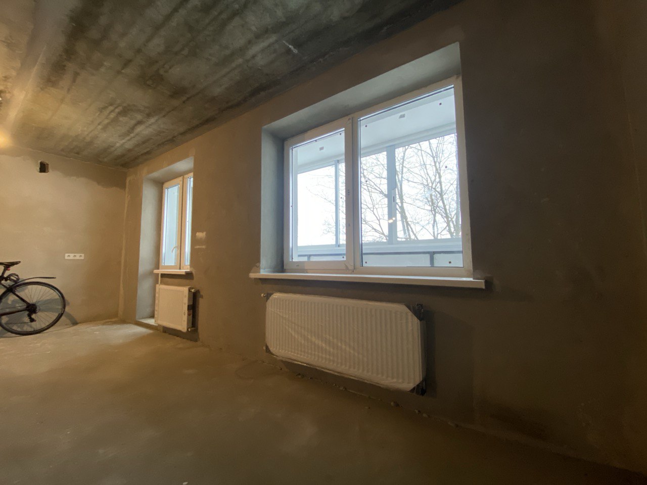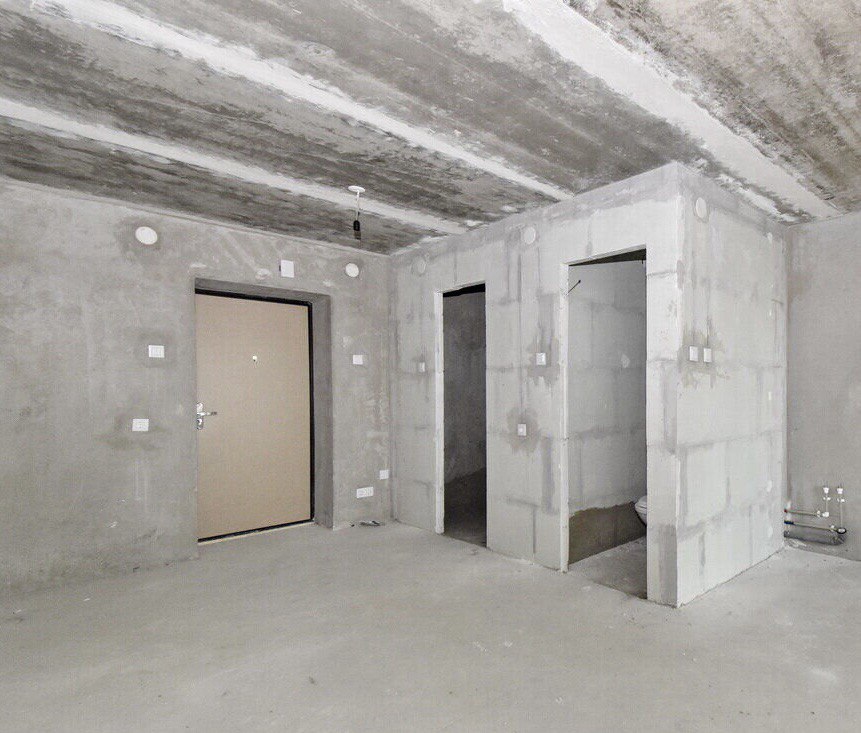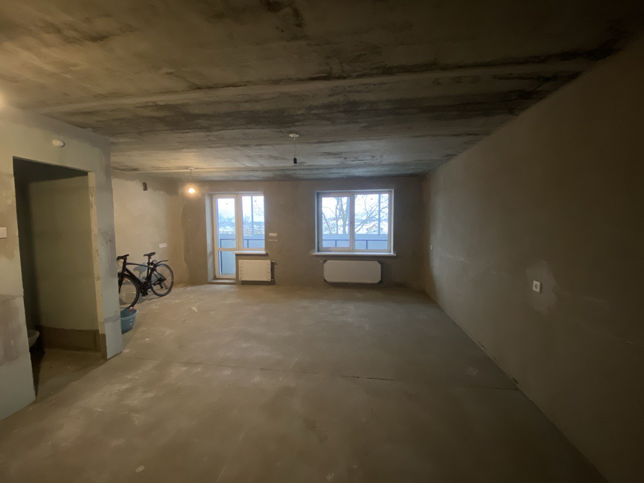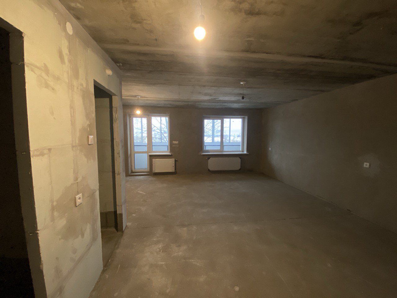 Ровная стяжка и ровные оштукатуренные стены. По квартире разведена электрика.