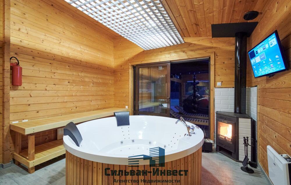Грамотно спланирован участок: навес для двух машин с подзарядкой для электромобиля, авто полив, ландшафтный дизайн, баня на дровах с камином, джакузи с современной акустикой, полы с подогревом.