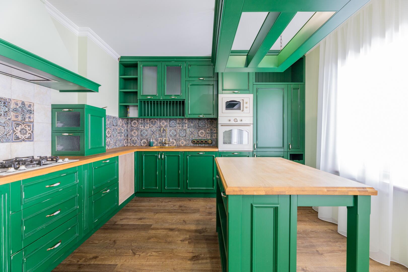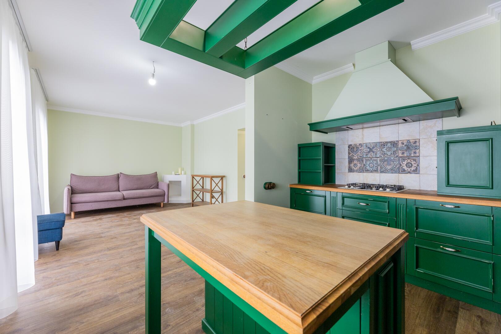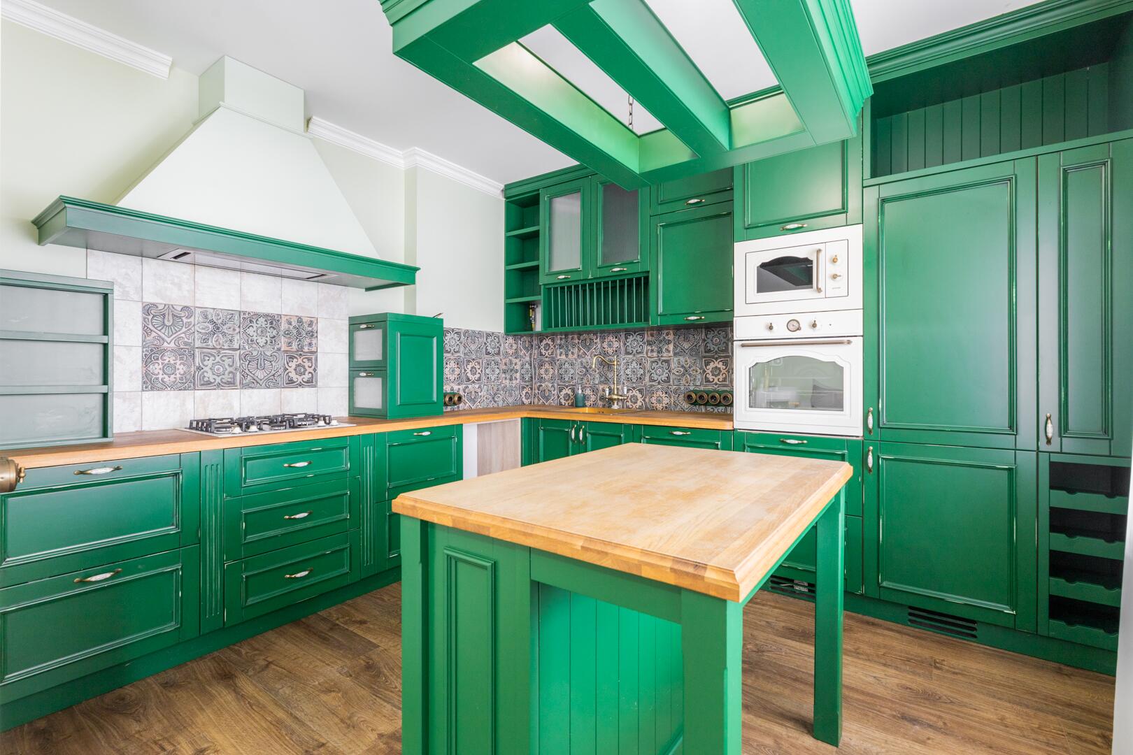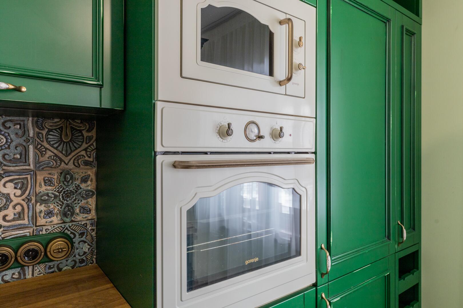 Кухонный гарнитур выполнен из массива также в ретро стиле, под стиль кухни подобрана и бытовая техника (холодильник и посудомоечная машина встроенные производства Electrolux), варочная панель, духовой шкаф и микроволновая печь производства фирмы «Gorenje», установлены мойка и кухонный смеситель из цветных металлов также в ретро стиле.